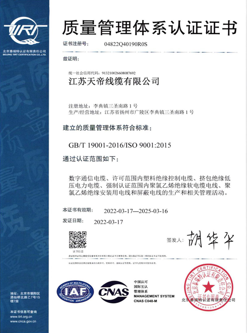 天帝線纜創建于1991年,是一家集研發、生產和銷售為一體的國家高新技術企業。本公司主營電力電纜、通信電纜、射頻電纜、控制電纜、計算機電纜、耐高溫防火電纜、補償電纜、聚氯乙烯絕緣電纜電線、數據線、光纜及全鏈路綜合布線產品。始終以前瞻性的眼光洞悉智能傳輸基礎建設的發展,服務于電力工程、石油化工、環保工程、高端裝備、信息傳輸等領域的綜合性企業。公司位于歷史文化古城揚州市李典工業園。現有占地面積35000平方米的標準化生產廠房,擁有多條世界先進的自動化電纜光纜生產線和的生產檢測設備,雄厚的技術力量和省級研發實驗室,年生產能力達15億元,旗下三家子公司、全國56個辦事處和經銷點。